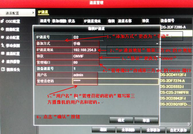 再進入錄像機主菜單—通道管理—通道配置—IP通道,選擇該通道,點擊“編輯”,添加方式改成“手動”,確認第三方攝像機IP地址與錄像機內部網卡IPV4地址同網段,選擇“ONVIF協議”,輸入攝像機管理端口以及攝像機用戶名、密碼,後點擊“確定”。