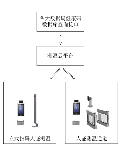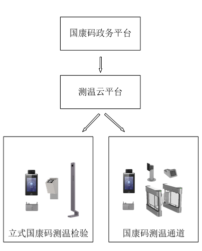 國康碼方案,可通過立式支架部署,也可搭配人員通道產品進行部署。目前,測溫數據雲平台已經完成與國家政務服務平台對接,使用國康碼方案,可以采用下列三種認證模式進行核驗