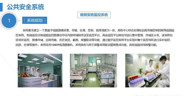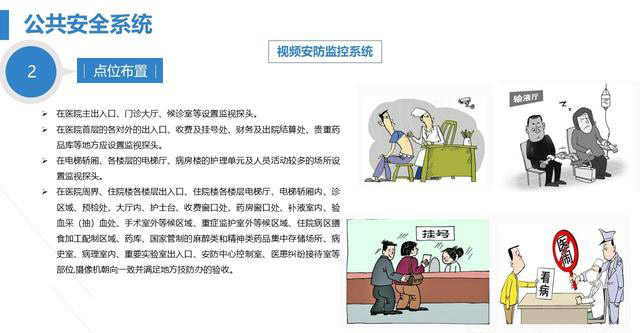 Ø在醫院周界、住院樓各樓層出入口、住院樓各樓層電梯廳、電梯轎廂內、診區域、預檢處、大廳內、護士台、收費窗口處、藥房窗口處、補液室內、驗血采(抽)血處、手術室外等候區域、重症監護室外等候區域、住院病區膳食加工配製區域、藥庫、國家管製的麻醉類和精神類藥品集中存儲場所、病史室、病理室內、重要實驗室出入口、安防中心控製室、醫患糾紛接待室等部位,攝像機朝向一致並滿足地方技防辦的驗收。