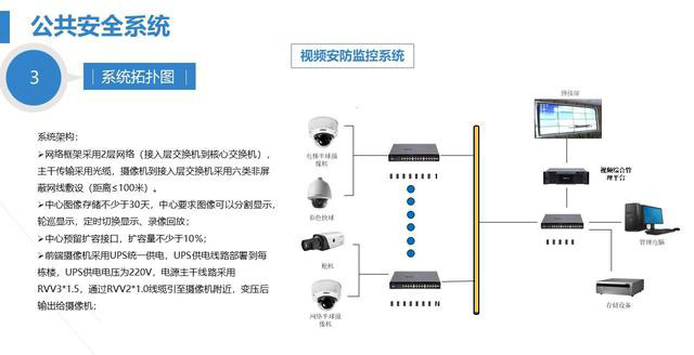 Ø前端攝像機采用UPS統一供電,UPS供電線路部署到每棟樓,UPS供電電壓為220V,電源主幹線路采用RVV3*1.5,通過RVV2*1.0線纜引至攝像機附近,變壓後輸出給攝像機;