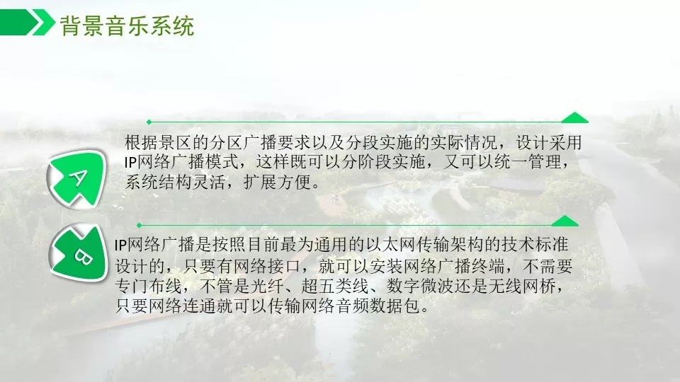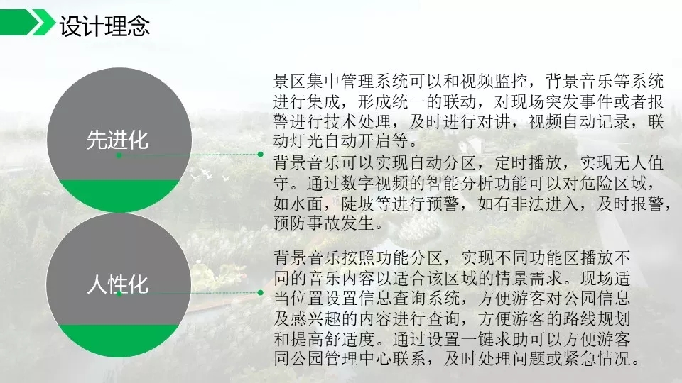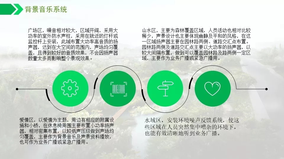 背景音樂按照功能分區,實現不同功能區播放不同的音樂內容以適合該區域的情景需求。現場適當位置設置信息查詢係統,方便遊客對公園信息及感興趣的內容進行查詢,方便遊客的路線規劃和提高舒適度。通過設置一鍵求助可以方便遊客同公園管理中心聯係,及時處理問題或緊急情況。