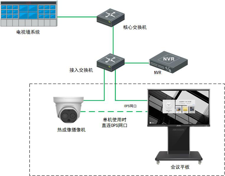 單機部署:熱成像半球通過網線連接OPS,OPS插入會議平板,並在ops的Windows操作係統上安裝4200客戶端軟件即可快速部署使用。(推薦搭配)