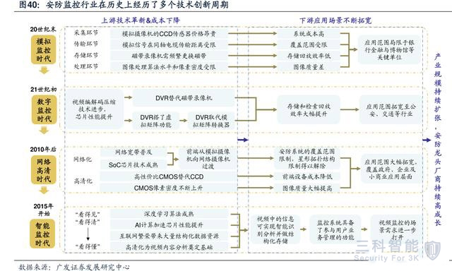 曆史上看,依靠上遊的圖像處理和編碼壓縮算法、視頻監控芯片、圖像傳感器、光學鏡頭等領域的技術創新,午夜福利免费影院係統經曆了從模擬時代到數字化時代、再到網絡高清時代的升級換代,功能更加強大的同時成本不斷降低,因此實現了應用場景的不斷拓寬和產業規模的持續增長。